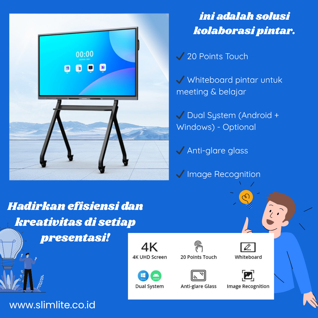 Layar Interaktif Slimlite dirancang untuk meningkatkan kolaborasi, presentasi, hingga proses pembelajaran dengan cara yang lebih modern dan efisien. Dengan teknologi sentuh responsif, fitur whiteboard pintar, serta tampilan 4K UHD yang jernih, perangkat ini menjadi solusi ideal untuk ruang meeting, kantor, sekolah, dan berbagai kebutuhan profesional lainnya.